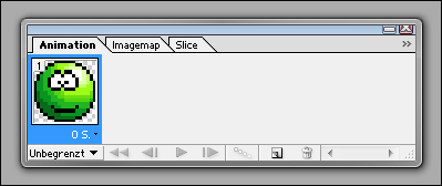 In dieser sollte euch euer Werk als Frame Nummer „1“ anlachen. Eine Animation besteht einfach aus unterschiedlichen Ansichten (Frames) eures Objekts, welche eine gewisse Zeit sichtbar sind und dann durch den Folgeframe ersetzt werden. Das Ganze startet bei Frame 1 und ihr bestimmt, wie oft die Abfolge euer Frames wiederholt wird. Damit eine Animation ständig wiederholt wird, klickt unter dem ersten Frame auf das Pulldown-Menue und wählt „Unbegrenzt“ aus. Maximal sind 30.000 Wiederholungen möglich, ich arbeite aber eigentlich immer mit „Unbegrenzt“.