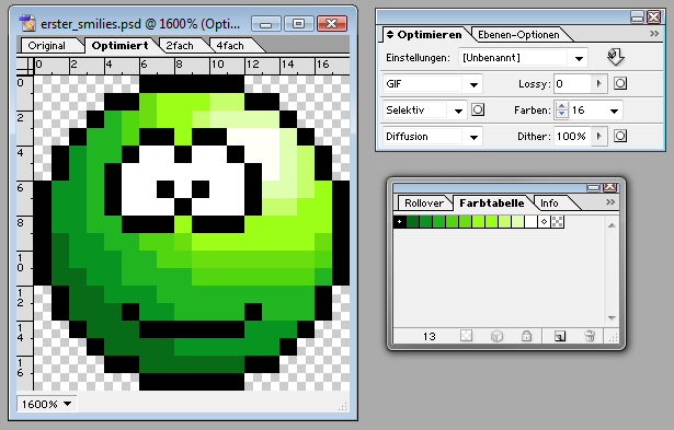 In der Optimieren-Palette wählt ihr die Einstellung wie im folgenden Screenshot gezeigt. Die korrekte Anzahl der Farben könnt ihr mit Hilfe der Farbtabelle ermitteln. Wählt ihr für unser Beispiel z.B. acht Farben, so wird das Bild entstellt, da zu wenig Farben verfügbar sind. Erhöht ihr auf 16 Farben sieht das Ganze schon besser aus und in der Farbtablle werden auch weitere Farbkästchen erscheinen. Ein erhöhen der Farben auf 32 wird keine Veränderung mehr in der Farbtabelle erzeugen, was bedeutet, dass 16 Farben ausreichend sind. Die Anzahl der Farben ist in Zweier-Potenzen gestaffelt und reichen bis zum Maximalwert von 256, mehr Farben gehen also nicht! Umso weniger Farben, umso kleiner wird der Platzbedarf eures Smilies.